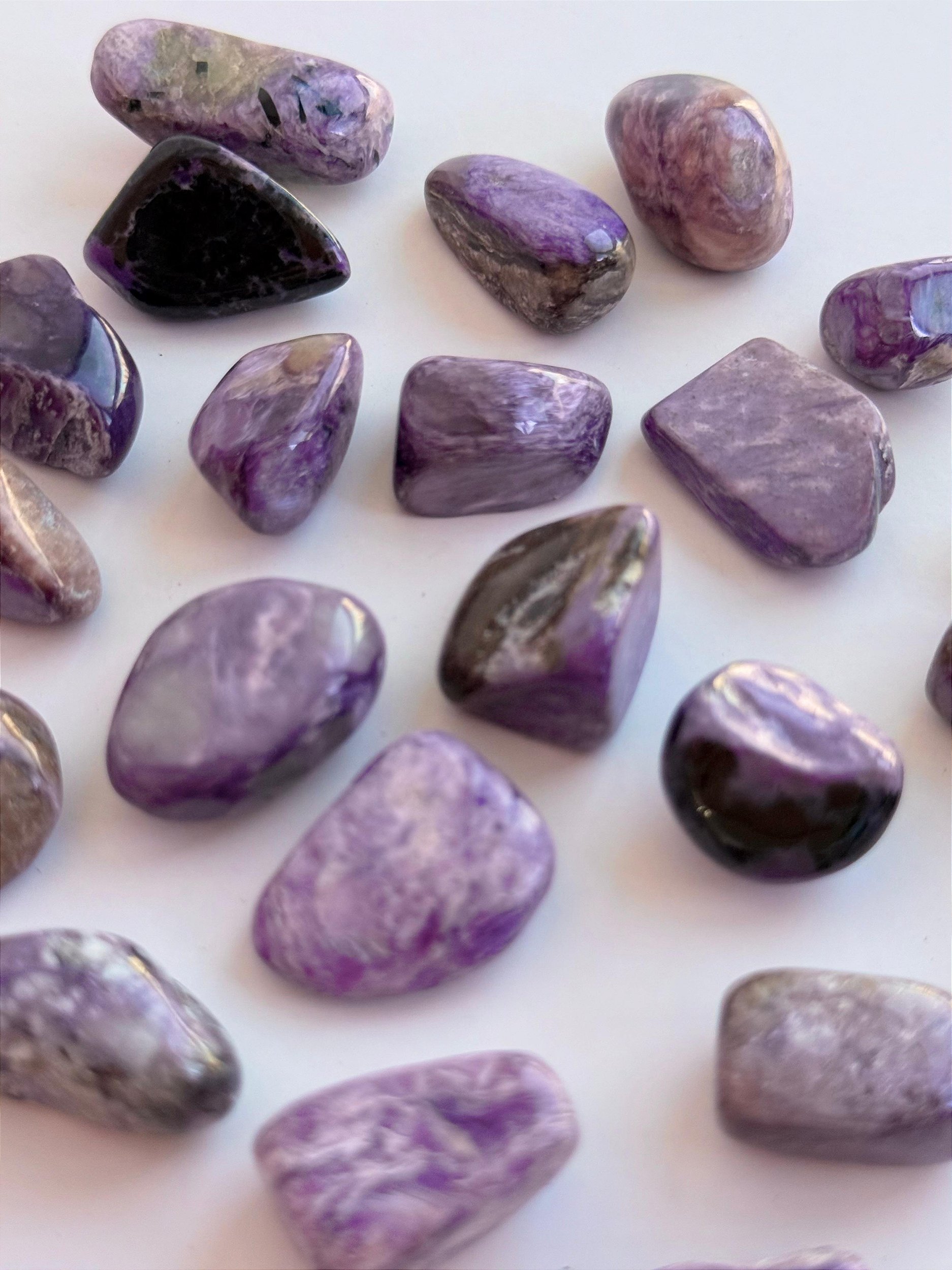 A Charoita é a pedra dos trabalhadores da luz, médiuns, curadores, terapeutas e missionários. Ela nos insipara a servir e aumenta nossa conexão com a luz, nos levando pelos caminhos da caridade, incentivando a nossa evolução e as dos que estão ao nosso redor.