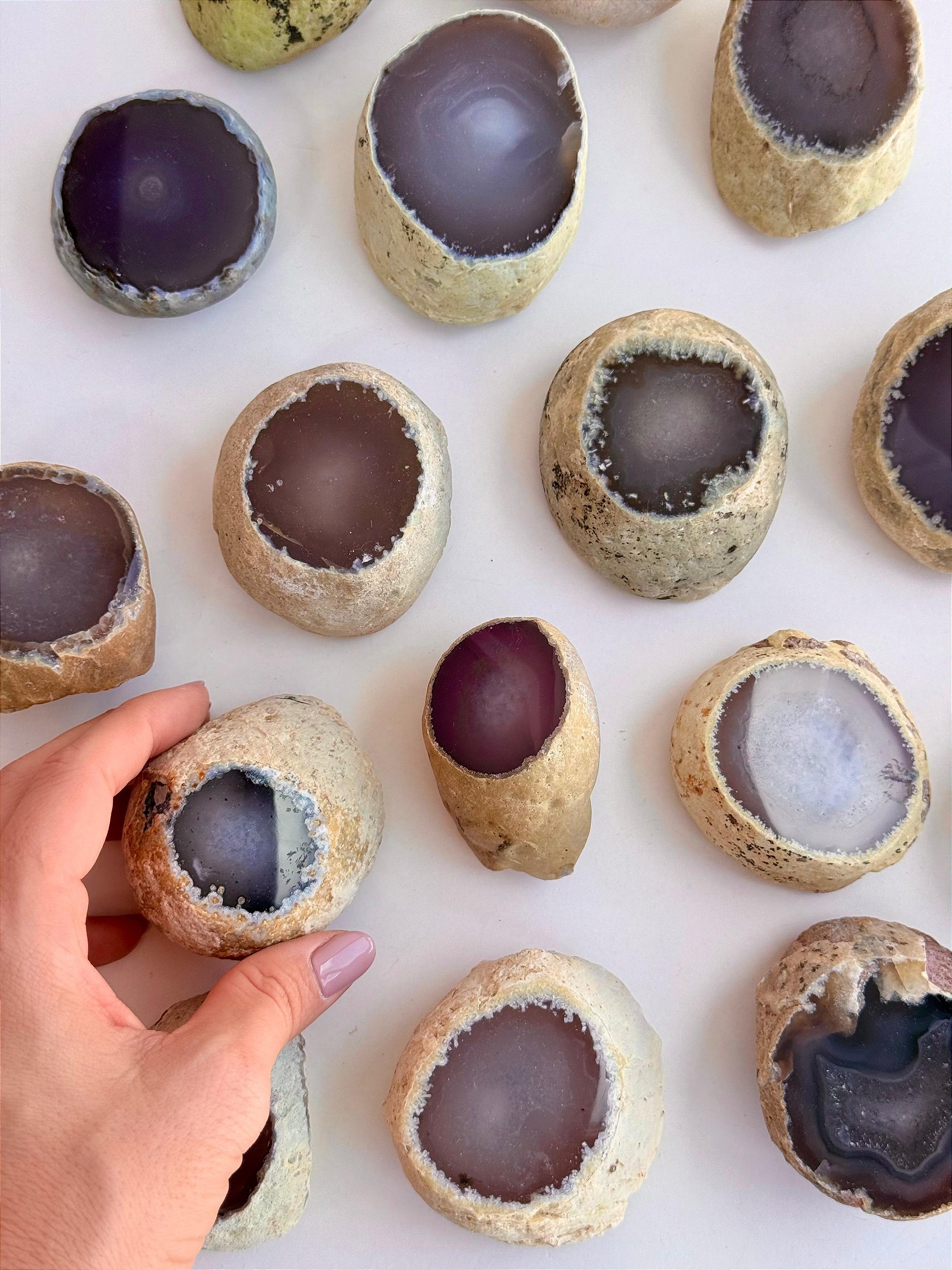 Os geodos conservam e ampliam a energia dentro deles, agindo como um gerador de energia. Graças ao seu formato com aparência de caverna, os geodos difundem lentamente a energia, suavizando-a. Podem ser usados para proteção e para estimular o crescimento espiritual. Os geodos ajudam a romper hábitos nocivos e são benéficos para personalidades viciosas e excessivamente indulgentes. A ágata proporciona equilíbrio emocional, físico e intelectual e auxilia na cura de bloqueios emocionais. Possui energia suave, estimula aceitação e a confiança em nós mesmos. Ela também intensifica as faculdades mentais, ao mesmo tempo que melhora a concentração.