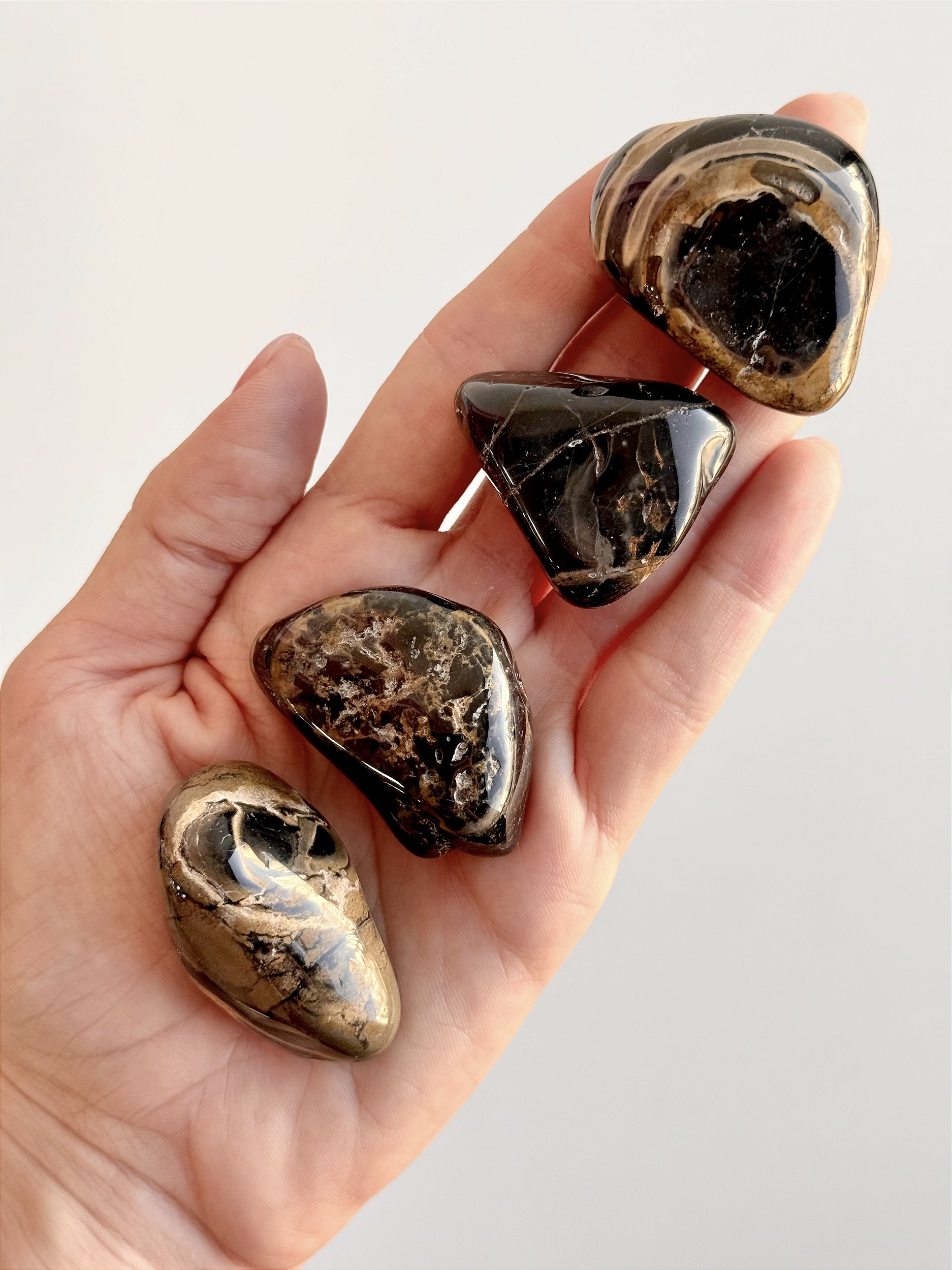 Protege contra influências negativas e energias densas. É perfeito para usar em locais carregados, em situações de conflito ou em ambientes de trabalho estressantes, pois ajuda a manter o centramento e o equilíbrio energético. Ele estabelece uma harmonia profunda entre corpo e alma, favorecendo o autocontrole e o senso de realidade, um cristal que nos ancora no presente e nos ensina a caminhar com firmeza.