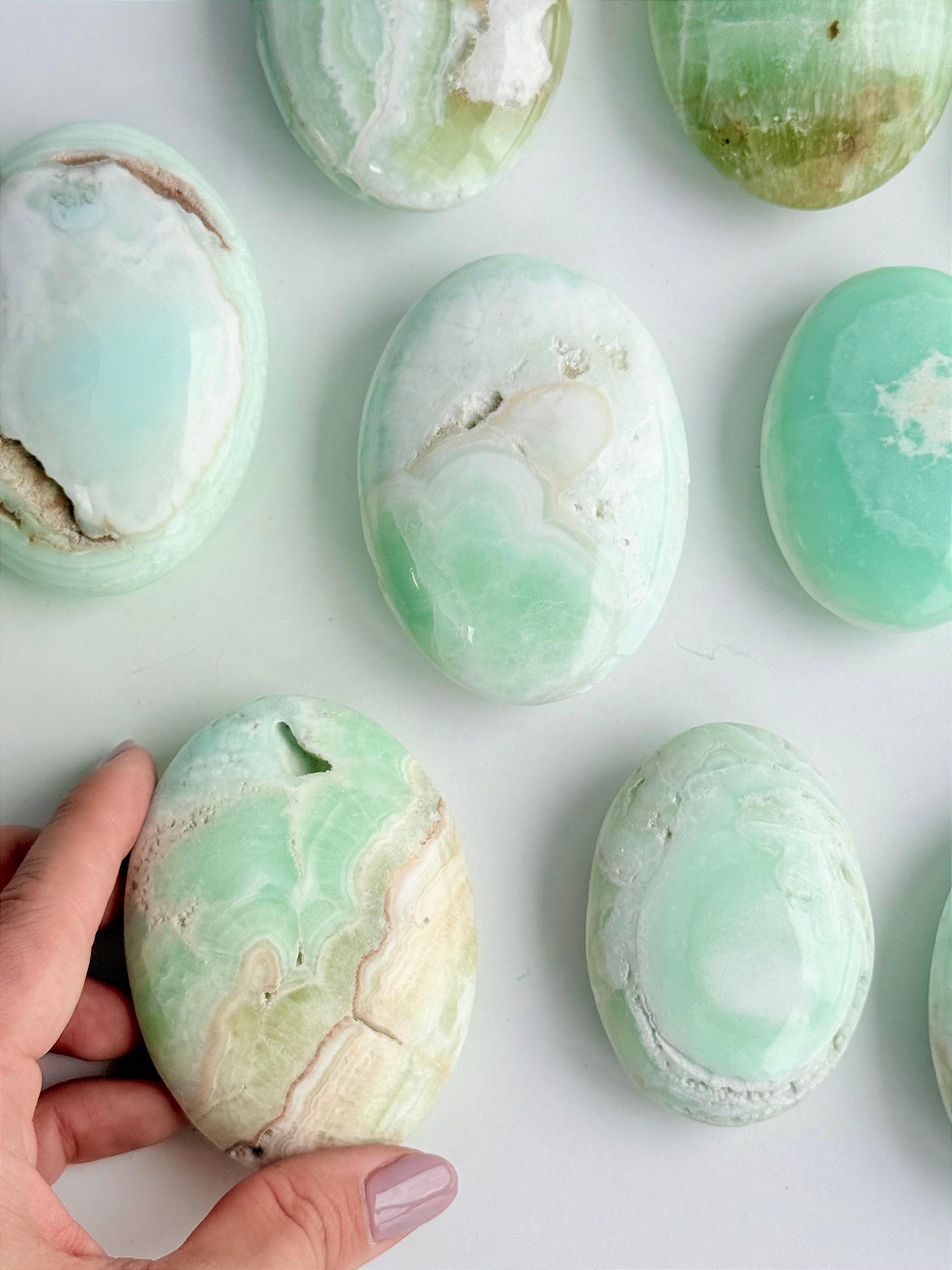 Visualmente, a calcita oceano apresenta uma paleta de cores suaves que variam entre tons de azul, verde e branco, lembrando as águas tranquilas do oceano. Esses tons suaves contribuem para a sensação de calma e equilíbrio que este cristal traz.